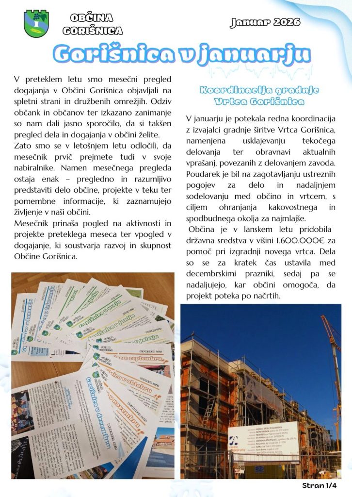 19. februarja, 2026 - V Občina By Aleš Zavec 0 GORIŠNICA V JANUARJU Ste že prelistali januarski mesečnik Občine Gorišnica? Objavljen pa je tudi na spletnih medijih. Prejšnji Vabilo za vključitev v Program Krepitev družine Naslednja Nedovoljeno odmetavanje pločevink in plastične embalaže v naravo